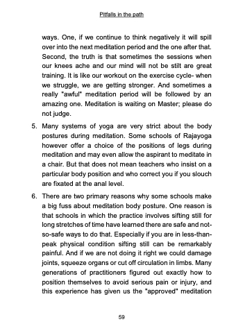 5. Many systems of yoga are very strict about the body postures during meditation. Some schools of Rajayoga however offer a choice of the positions of legs during meditation and may even allow the aspirant to meditate in a chair. But that does not mean teachers who insist on a particular body position and who correct you if you slouch are fixated at the anal level.