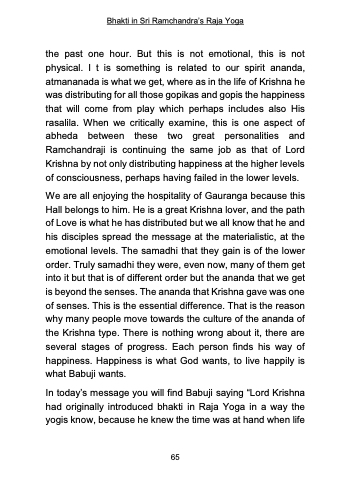 the past one hour. But this is not emotional, this is not physical. I t is something is related to our spirit ananda, atmananada is what we get, where as in the life of Krishna he was distributing for all those gopikas and gopis the happiness that will come from play which perhaps includes also His rasalila. When we critically examine, this is one aspect of abheda between these two great personalities and Ramchandraji is continuing the same job as that of Lord Krishna by not only distributing happiness at the higher levels of consciousness, perhaps having failed in the lower levels.