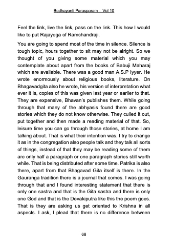 You are going to spend most of the time in silence. Silence is tough topic, hours together to sit may not be alright. So we thought of you giving some material which you may contemplate about apart from the books of Babuji Maharaj which are available. There was a good man A.S.P Iyyer. He wrote enormously about religious books, literature. On Bhagavadgita also he wrote, his version of interpretation what ever it is, copies of this was given last year or earlier to that. They are expensive, Bhavan’s publishes them. While going through that many of the abhyasis found there are good stories which they do not know otherwise. They culled it out, put together and then made a reading material of that. So, leisure time you can go through those stories, at home I am talking about. That is what their intention was. I try to change it as in the congregation also people talk and they talk all sorts of things, instead of that they may be reading some of them are only half a paragraph or one paragraph stories still worth while. That is being distributed after some time. Patrika is also there, apart from that Bhagavad Gita itself is there. In the Gauranga tradition there is a journal that comes. I was going through that and I found interesting statement that there is only one sastra and that is the Gita sastra and there is only one God and that is the Devakiputra like this the poem goes. That is they are asking us get oriented to Krishna in all aspects. I ask, I plead that there is no difference between