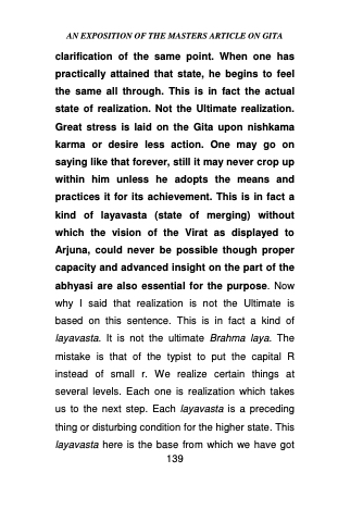 clarification of the same point. When one has practically attained that state, he begins to feel the same all through. This is in fact the actual state of realization. Not the Ultimate realization. Great stress is laid on the Gita upon nishkama karma or desire less action. One may go on saying like that forever, still it may never crop up within him unless he adopts the means and practices it for its achievement. This is in fact a kind of layavasta (state of merging) without which the vision of the Virat as displayed to Arjuna, could never be possible though proper capacity and advanced insight on the part of the abhyasi are also essential for the purpose. Now why I said that realization is not the Ultimate is based on this sentence. This is in fact a kind of layavasta. It is not the ultimate Brahma laya. The mistake is that of the typist to put the capital R instead of small r. We realize certain things at several levels. Each one is realization which takes us to the next step. Each layavasta is a preceding thing or disturbing condition for the higher state. This