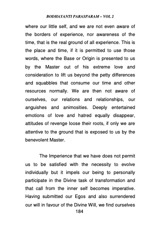 The Imperience that we have does not permit us to be satisfied with the necessity to evolve individually but it impels our being to personally participate in the Divine task of transformation and that call from the inner self becomes imperative. Having submitted our Egos and also surrendered