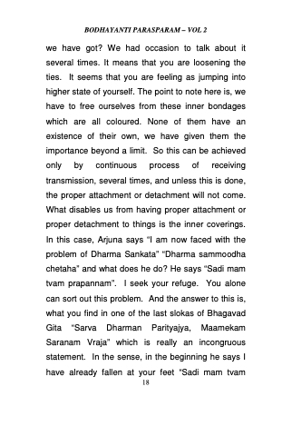 we have got? We had occasion to talk about it several times. It means that you are loosening the ties. It seems that you are feeling as jumping into higher state of yourself. The point to note here is, we have to free ourselves from these inner bondages which are all coloured. None of them have an existence of their own, we have given them the importance beyond a limit. So this can be achieved only by continuous process of receiving transmission, several times, and unless this is done, the proper attachment or detachment will not come. What disables us from having proper attachment or proper detachment to things is the inner coverings. In this case, Arjuna says “I am now faced with the problem of Dharma Sankata” “Dharma sammoodha chetaha” and what does he do? He says “Sadi mam tvam prapannam”. I seek your refuge. You alone can sort out this problem. And the answer to this is, what you find in one of the last slokas of Bhagavad Gita “Sarva Dharman Parityajya, Maamekam Saranam Vraja” which is really an incongruous statement. In the sense, in the beginning he says I