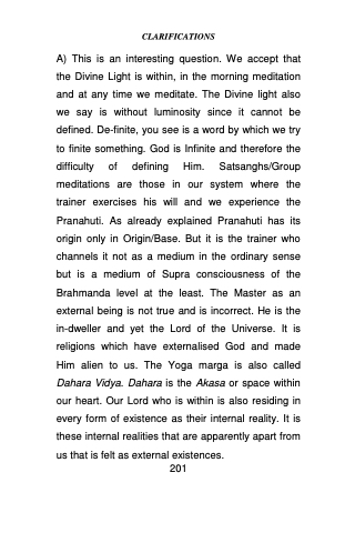 A) This is an interesting question. We accept that the Divine Light is within, in the morning meditation and at any time we meditate. The Divine light also we say is without luminosity since it cannot be defined. De-finite, you see is a word by which we try to finite something. God is Infinite and therefore the difficulty of defining Him. Satsanghs/Group meditations are those in our system where the trainer exercises his will and we experience the Pranahuti. As already explained Pranahuti has its origin only in Origin/Base. But it is the trainer who channels it not as a medium in the ordinary sense but is a medium of Supra consciousness of the Brahmanda level at the least. The Master as an external being is not true and is incorrect. He is the in-dweller and yet the Lord of the Universe. It is religions which have externalised God and made Him alien to us. The Yoga marga is also called Dahara Vidya. Dahara is the Akasa or space within our heart. Our Lord who is within is also residing in every form of existence as their internal reality. It is these internal realities that are apparently apart from