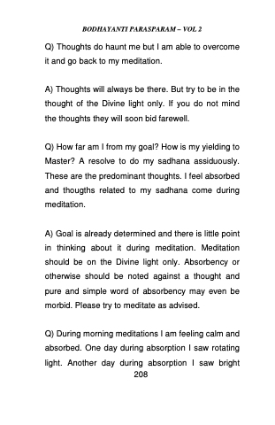 A) Thoughts will always be there. But try to be in the thought of the Divine light only. If you do not mind the thoughts they will soon bid farewell.