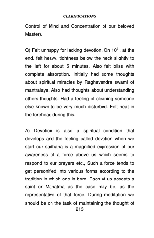 Q) Felt unhappy for lacking devotion. On 10th, at the end, felt heavy, tightness below the neck slightly to the left for about 5 minutes. Also felt bliss with complete absorption. Initially had some thoughts about spiritual miracles by Raghavendra swami of mantralaya. Also had thoughts about understanding others thoughts. Had a feeling of cleaning someone else known to be very much disturbed. Felt heat in the forehead during this.