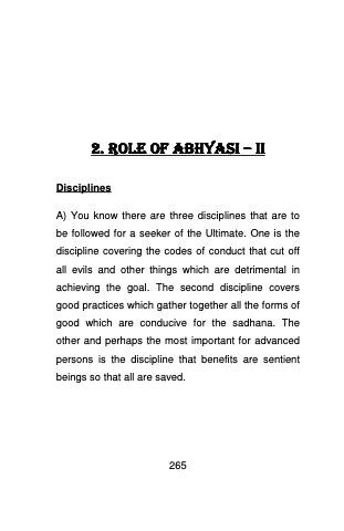 A) You know there are three disciplines that are to be followed for a seeker of the Ultimate. One is the discipline covering the codes of conduct that cut off all evils and other things which are detrimental in achieving the goal. The second discipline covers good practices which gather together all the forms of good which are conducive for the sadhana. The other and perhaps the most important for advanced persons is the discipline that benefits are sentient beings so that all are saved.