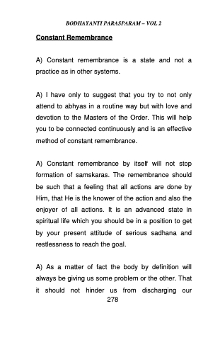 A) Constant remembrance by itself will not stop formation of samskaras. The remembrance should be such that a feeling that all actions are done by Him, that He is the knower of the action and also the enjoyer of all actions. It is an advanced state in spiritual life which you should be in a position to get by your present attitude of serious sadhana and restlessness to reach the goal.