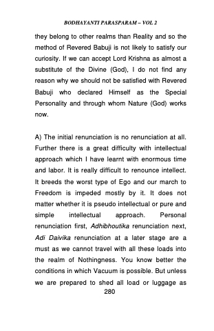 A) The initial renunciation is no renunciation at all. Further there is a great difficulty with intellectual approach which I have learnt with enormous time and labor. It is really difficult to renounce intellect. It breeds the worst type of Ego and our march to Freedom is impeded mostly by it. It does not matter whether it is pseudo intellectual or pure and simple intellectual approach. Personal renunciation first, Adhibhoutika renunciation next, Adi Daivika renunciation at a later stage are a must as we cannot travel with all these loads into the realm of Nothingness. You know better the conditions in which Vacuum is possible. But unless