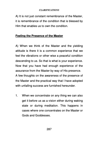 A) When we think of the Master and the yielding attitude is there it is a common experience that we feel the vibrations or other wise a peaceful condition descending to us. So that is what is your experience. Now that you have had enough experience of the assurance from the Master by way of His presence. A few thoughts on the awareness of the presence of the Master and the practical way that I have adopted with unfailing success are furnished hereunder.
