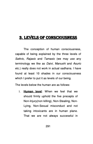 The conception of human consciousness, capable of being explained by the three levels of Sattvic, Rajasic and Tamasic (we may use any terminology we like as Daivi, Manushi and Asuric etc.) really does not work in actual sadhana. I have found at least 10 shades in our consciousness which I prefer to put it as levels of our being.