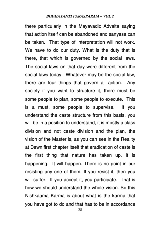 there particularly in the Mayavadic Advaita saying that action itself can be abandoned and sanyasa can be taken. That type of interpretation will not work. We have to do our duty. What is the duty that is there, that which is governed by the social laws. The social laws on that day were different from the social laws today. Whatever may be the social law, there are four things that govern all action. Any society if you want to structure it, there must be some people to plan, some people to execute. This is a must, some people to supervise. If you understand the caste structure from this basis, you will be in a position to understand, it is mostly a class division and not caste division and the plan, the vision of the Master is, as you can see in the Reality at Dawn first chapter itself that eradication of caste is the first thing that nature has taken up. It is happening. It will happen. There is no point in our resisting any one of them. If you resist it, then you will suffer. If you accept it, you participate. That is how we should understand the whole vision. So this Nishkaama Karma is about what is the karma that
