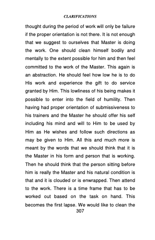 thought during the period of work will only be failure if the proper orientation is not there. It is not enough that we suggest to ourselves that Master is doing the work. One should clean himself bodily and mentally to the extent possible for him and then feel committed to the work of the Master. This again is an abstraction. He should feel how low he is to do His work and experience the gift to do service granted by Him. This lowliness of his being makes it possible to enter into the field of humility. Then having had proper orientation of submissiveness to his trainers and the Master he should offer his self including his mind and will to Him to be used by Him as He wishes and follow such directions as may be given to Him. All this and much more is meant by the words that we should think that it is the Master in his form and person that is working. Then he should think that the person sitting before him is really the Master and his natural condition is that and it is clouded or is enwrapped. Then attend to the work. There is a time frame that has to be worked out based on the task on hand. This