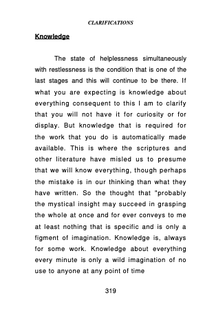 The state of helplessness simultaneously with restlessness is the condition that is one of the last stages and this will continue to be there. If what you are expecting is knowledge about everything consequent to this I am to clarify that you will not have it for curiosity or for display. But knowledge that is required for the work that you do is automatically made available. This is where the scriptures and other literature have misled us to presume that we will know everything, though perhaps the mistake is in our thinking than what they have written. So the thought that "probably the mystical insight may succeed in grasping the whole at once and for ever conveys to me at least nothing that is specific and is only a figment of imagination. Knowledge is, always for some work. Knowledge about everything every minute is only a wild imagination of no use to anyone at any point of time