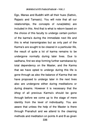 Ego, Manas and Buddhi with all their hues (Sattvic, Rajasic and Tamasic). You will note that all our relationships, the concepts of runa(debts) are included in this. And that is what is reborn based on the choice of this faculty to undergo certain portion of the karma's during the immediate next life and this is what transmigrates but as only part of the Karma's are sought to be cleared in a particular life, the result of quite a lot of karma remains to be undergone normally during later lives. Due to sadhana, first we stop forming further samskaras by total dependency on the Master, and the Karma that we have opted to undergo during this life is gone through as also the balance of Karma that we have proposed to undergo later in the next lives also are undergone either during meditations or during dreams. However it is necessary that the bhog of all previous Karma's should be gone through before we come up to the stage of mere identity from the level of individuality. You are aware that unless the help of the Master is there through Pranahuti and we attend to the cleaning