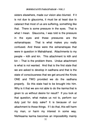 sisters elsewhere, made our vision also blurred. If it is not due to glaucoma, it must be at least due to cataract that most of us are suffering, something like that. There is some pressure in the eyes. That is what I mean. Glaucoma, I was told is the pressure in the eyes and these pressures are the eshanatrayas. That is what makes you really confused. And these were the eshanatrayas that were in question in Mahabharat. Attachments to my people – kith and kin. This attachment to kith and kin – That is the problem there. Undue attachment is what is not wanted. And that is the first state that we are asked to develop in sadhana and that is the state of consciousness that we get around the Knots ONE and TWO provided we do the sadhana properly. So this state had to be brought into him. Why is it that we are not able to do the karma that is given to us without desire for result? If you look at that question, what makes us not to, perform our duty just for duty sake? It is because of our attachment to these things. If I do that, this will harm my man, or harm my interest in some way.