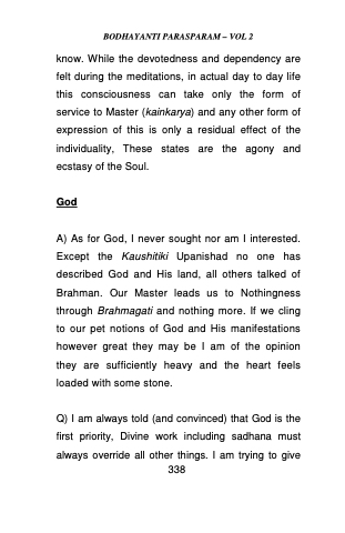 A) As for God, I never sought nor am I interested. Except the Kaushitiki Upanishad no one has described God and His land, all others talked of Brahman. Our Master leads us to Nothingness through Brahmagati and nothing more. If we cling to our pet notions of God and His manifestations however great they may be I am of the opinion they are sufficiently heavy and the heart feels loaded with some stone.