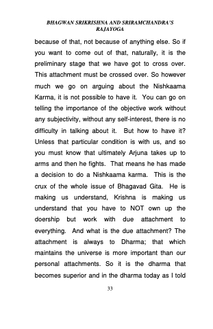 because of that, not because of anything else. So if you want to come out of that, naturally, it is the preliminary stage that we have got to cross over. This attachment must be crossed over. So however much we go on arguing about the Nishkaama Karma, it is not possible to have it. You can go on telling the importance of the objective work without any subjectivity, without any self-interest, there is no difficulty in talking about it. But how to have it? Unless that particular condition is with us, and so you must know that ultimately Arjuna takes up to arms and then he fights. That means he has made a decision to do a Nishkaama karma. This is the crux of the whole issue of Bhagavad Gita. He is making us understand, Krishna is making us understand that you have to NOT own up the doership but work with due attachment to everything. And what is the due attachment? The attachment is always to Dharma; that which maintains the universe is more important than our personal attachments. So it is the dharma that becomes superior and in the dharma today as I told