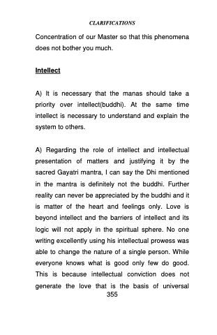 A) Regarding the role of intellect and intellectual presentation of matters and justifying it by the sacred Gayatri mantra, I can say the Dhi mentioned in the mantra is definitely not the buddhi. Further reality can never be appreciated by the buddhi and it is matter of the heart and feelings only. Love is beyond intellect and the barriers of intellect and its logic will not apply in the spiritual sphere. No one writing excellently using his intellectual prowess was able to change the nature of a single person. While everyone knows what is good only few do good. This is because intellectual conviction does not