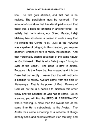 line. So that gets affected, and that has to be revived. The parallelism must be restored. The amount of curvature that has developed is such that there was a need for bringing in another force. To satisfy that norm alone, our Grand Master, Lalaji Maharaj has structured a person in such a way that He exhibits the Centre Itself. Just as the Purusha was capable of bringing in this creation, you require another Personality here to rectify the situation. And that Personality should be almost of the same nature as God himself. That is why Babuji says “I bring in Zaat or the Base”. The Base is now in action. Because it is the Base that has created and it is the Base that can rectify. Lesser than that will not be in a position to rectify. Avatars come from the field of Mahamaya. That is the power of God. Powers of God will not be in a position to maintain this order today and the Essence of God has to come. So, in a sense, you will find the SPECIAL PERSONALITY who is working, is more than the Avatar and at the same time He is subordinate to the Avatar. The Avatar has come according to a scheme of things