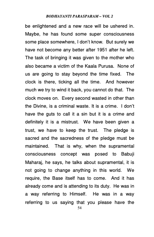 be enlightened and a new race will be ushered in. Maybe, he has found some super consciousness some place somewhere, I don’t know. But surely we have not become any better after 1951 after he left. The task of bringing it was given to the mother who also became a victim of the Kaala Purusa. None of us are going to stay beyond the time fixed. The clock is there, ticking all the time. And however much we try to wind it back, you cannot do that. The clock moves on. Every second wasted in other than the Divine, is a criminal waste. It is a crime. I don’t have the guts to call it a sin but it is a crime and definitely it is a mistrust. We have been given a trust, we have to keep the trust. The pledge is sacred and the sacredness of the pledge must be maintained. That is why, when the supramental consciousness concept was posed to Babuji Maharaj, he says, he talks about supramental, it is not going to change anything in this world. We require, the Base itself has to come. And it has already come and is attending to its duty. He was in a way referring to Himself. He was in a way