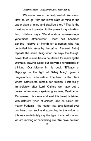 We come now to the next point of discussion. How do we go from the lower state of mind to the upper state of mind and stabilize there? That is the most important question to the present day situation. Lord Krishna says "Bandhuratma atmanastasya yenatmana atmanajitha". Ones’ self becomes bandhu (relative or friend) for a person who has controlled his atma by the atma. Revered Babuji repeats the same thing when he says the thought power that is in us has to be utilized for reaching the Ultimate, leaving aside our perverse tendencies of thinking. Our Master in his book “Efficacy of Rajayoga in the light of Sahaj Marg” gave a diagrammatic picturisation. The heart is the place where samskaras remain for fruition. Historically, immediately after Lord Krishna we have got a person of enormous spiritual greatness, Vardhaman Mahaveera. He came and said this heart is tainted with different types of colours, and he called that matter Pudgala - the matter that gets formed over our heart, our soul and according to the colour of this we can definitely say the type of man with whom