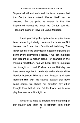I was practicing the system for a quite some time before I got clarity because the inner conflict between the 'L' and the 'U' continued fairly long. The lower seems to be enormously capable of pulling us down every alternative second. If we can maintain our thought at a higher plane, for example in the morning meditation, had we been able to maintain our thought on Lord Krishna whose Birthday we have come together to celebrate and understood the identity between Him and our Master and also identified Him with the several avatars that have come earlier, we should not entertain any other thought than that of Him. But the lower had its own play however small it might be.