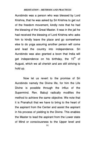 Now let us revert to the promise of Sri Aurobindo namely the Divine life, for him the Life Divine is possible through the influx of the Supermind. Rev. Babuji radically modifies the method to achieve the same objective. We note that it is Pranahuti that we have to bring to the heart of the aspirant from the Center and assist the aspirant in his process of yielding to the Divine. This enables the Master to lead the aspirant from the Lower state