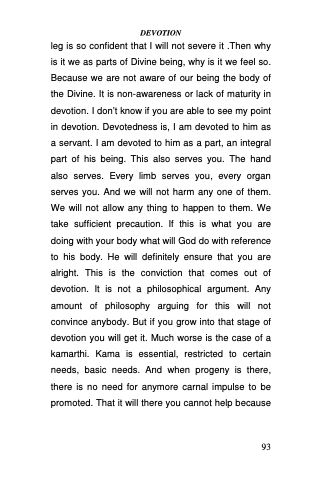 leg is so confident that I will not severe it .Then why is it we as parts of Divine being, why is it we feel so. Because we are not aware of our being the body of the Divine. It is non-awareness or lack of maturity in devotion. I don’t know if you are able to see my point in devotion. Devotedness is, I am devoted to him as a servant. I am devoted to him as a part, an integral part of his being. This also serves you. The hand also serves. Every limb serves you, every organ serves you. And we will not harm any one of them. We will not allow any thing to happen to them. We take sufficient precaution. If this is what you are doing with your body what will God do with reference to his body. He will definitely ensure that you are alright. This is the conviction that comes out of devotion. It is not a philosophical argument. Any amount of philosophy arguing for this will not convince anybody. But if you grow into that stage of devotion you will get it. Much worse is the case of a kamarthi. Kama is essential, restricted to certain needs, basic needs. And when progeny is there, there is no need for anymore carnal impulse to be promoted. That it will there you cannot help because