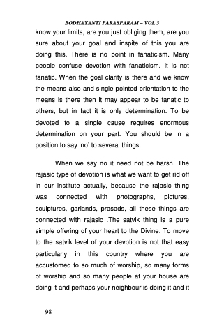 know your limits, are you just obliging them, are you sure about your goal and inspite of this you are doing this. There is no point in fanaticism. Many people confuse devotion with fanaticism. It is not fanatic. When the goal clarity is there and we know the means also and single pointed orientation to the means is there then it may appear to be fanatic to others, but in fact it is only determination. To be devoted to a single cause requires enormous determination on your part. You should be in a position to say ‘no’ to several things.
