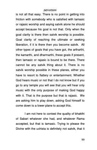 is not all that easy. There is no point in getting into friction with somebody who is satisfied with tamasic or rajasic worship and saying satvik alone he should accept because his goal is not that. Only when the goal clarity is there then satvik worship is possible. Goal clarity of reaching the ultimate or seeking liberation, if it is there then you become satvik. All other types of goals that you have got, the artharthi, the kamarthi, and dharmarthi, these goals if present, then tamasic or rajasic is bound to be there. There cannot be any satvik thing about it. There is no satvik worship possible in these planes, either you have to resort to flattery or entertainment. Whether God hears music or not that I do not know but if you go to any temple you will see that you will hear only music with the only purpose of making God happy with it. That is the purpose but that is rajasic. We are asking him to play down, asking God himself to come down to a lower plane to accept this.