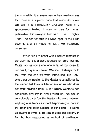 the impossible. It is awareness in the consciousness that there is a superior force that responds to our call and it is immediately available. Faith is a spontaneous feeling. It does not care for human justification. It is always in tune with a higher Truth. The door of faith is always open to the Truth beyond, and by virtue of faith, we transcend ourselves.