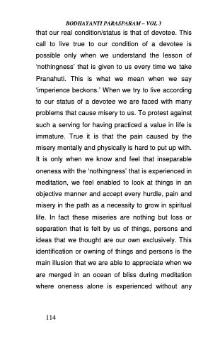 that our real condition/status is that of devotee. This call to live true to our condition of a devotee is possible only when we understand the lesson of ‘nothingness’ that is given to us every time we take Pranahuti. This is what we mean when we say ‘imperience beckons.’ When we try to live according to our status of a devotee we are faced with many problems that cause misery to us. To protest against such a serving for having practiced a value in life is immature. True it is that the pain caused by the misery mentally and physically is hard to put up with. It is only when we know and feel that inseparable oneness with the ‘nothingness’ that is experienced in meditation, we feel enabled to look at things in an objective manner and accept every hurdle, pain and misery in the path as a necessity to grow in spiritual life. In fact these miseries are nothing but loss or separation that is felt by us of things, persons and ideas that we thought are our own exclusively. This identification or owning of things and persons is the main illusion that we are able to appreciate when we are merged in an ocean of bliss during meditation where oneness alone is experienced without any