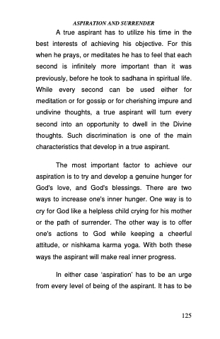 The most important factor to achieve our aspiration is to try and develop a genuine hunger for God's love, and God's blessings. There are two ways to increase one's inner hunger. One way is to cry for God like a helpless child crying for his mother or the path of surrender. The other way is to offer one's actions to God while keeping a cheerful attitude, or nishkama karma yoga. With both these ways the aspirant will make real inner progress.