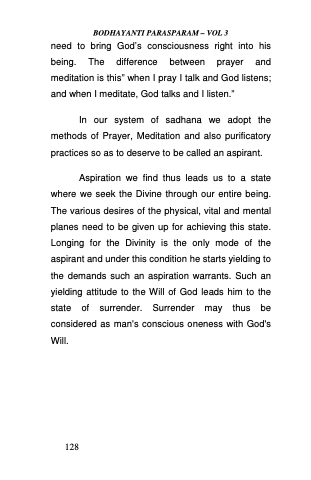 Aspiration we find thus leads us to a state where we seek the Divine through our entire being. The various desires of the physical, vital and mental planes need to be given up for achieving this state. Longing for the Divinity is the only mode of the aspirant and under this condition he starts yielding to the demands such an aspiration warrants. Such an yielding attitude to the Will of God leads him to the state of surrender. Surrender may thus be considered as man's conscious oneness with God's Will.
