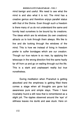 mind benign and useful. We need to see what the mind is and also what it is not. The mind has a creative genius and therefore enjoys parallel status with that of the Divine. Even though such a freedom is there many of us do not understand the same and funnily lead ourselves to be bound by its creations. The ideas which are its windows (its own creations) attracts us to look through them always. We like to live and die looking through the windows of the mind. This is how we instead of living in freedom prefer to suffer bondages which are our creation. Though our true nature is so near, by applying the telescope in the wrong direction find the same hazily far off from us and go on wailing through out the life. This is a stark and unpleasant reality but true nonetheless.