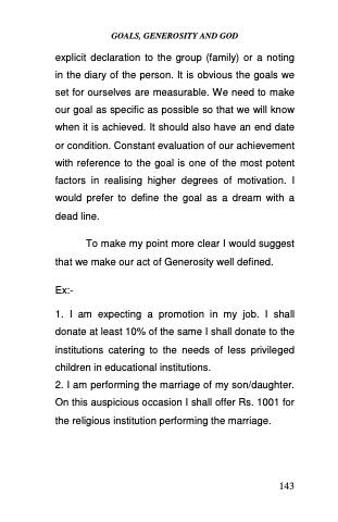 explicit declaration to the group (family) or a noting in the diary of the person. It is obvious the goals we set for ourselves are measurable. We need to make our goal as specific as possible so that we will know when it is achieved. It should also have an end date or condition. Constant evaluation of our achievement with reference to the goal is one of the most potent factors in realising higher degrees of motivation. I would prefer to define the goal as a dream with a dead line.