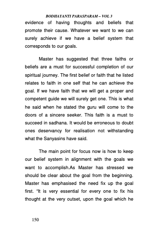 Master has suggested that three faiths or beliefs are a must for successful completion of our spiritual journey. The first belief or faith that he listed relates to faith in one self that he can achieve the goal. If we have faith that we will get a proper and competent guide we will surely get one. This is what he said when he stated the guru will come to the doors of a sincere seeker. This faith is a must to succeed in sadhana. It would be erroneous to doubt ones deservancy for realisation not withstanding what the Sanyasins have said.