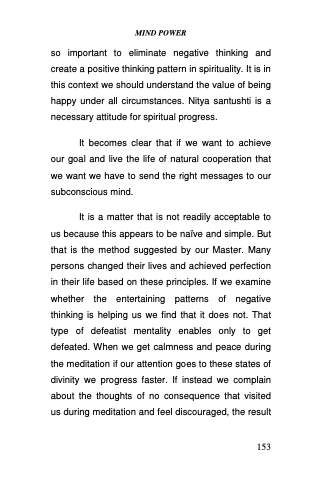 so important to eliminate negative thinking and create a positive thinking pattern in spirituality. It is in this context we should understand the value of being happy under all circumstances. Nitya santushti is a necessary attitude for spiritual progress.