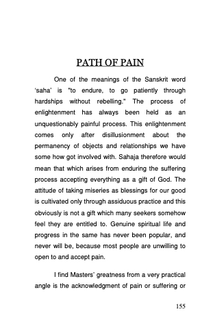 One of the meanings of the Sanskrit word ‘saha’ is "to endure, to go patiently through hardships without rebelling." The process of enlightenment has always been held as an unquestionably painful process. This enlightenment comes only after disillusionment about the permanency of objects and relationships we have some how got involved with. Sahaja therefore would mean that which arises from enduring the suffering process accepting everything as a gift of God. The attitude of taking miseries as blessings for our good is cultivated only through assiduous practice and this obviously is not a gift which many seekers somehow feel they are entitled to. Genuine spiritual life and progress in the same has never been popular, and never will be, because most people are unwilling to open to and accept pain.