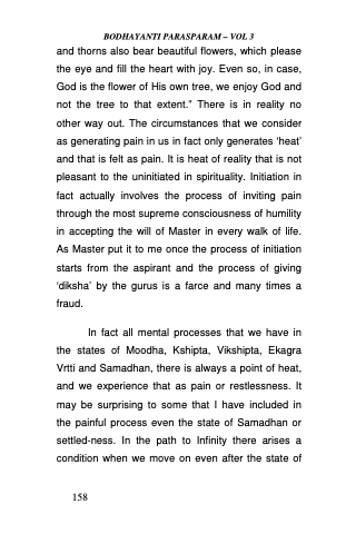 and thorns also bear beautiful flowers, which please the eye and fill the heart with joy. Even so, in case, God is the flower of His own tree, we enjoy God and not the tree to that extent.” There is in reality no other way out. The circumstances that we consider as generating pain in us in fact only generates ‘heat’ and that is felt as pain. It is heat of reality that is not pleasant to the uninitiated in spirituality. Initiation in fact actually involves the process of inviting pain through the most supreme consciousness of humility in accepting the will of Master in every walk of life. As Master put it to me once the process of initiation starts from the aspirant and the process of giving ‘diksha’ by the gurus is a farce and many times a fraud.