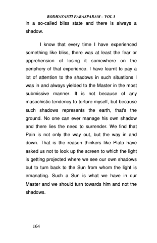 I know that every time I have experienced something like bliss, there was at least the fear or apprehension of losing it somewhere on the periphery of that experience. I have learnt to pay a lot of attention to the shadows in such situations I was in and always yielded to the Master in the most submissive manner. It is not because of any masochistic tendency to torture myself, but because such shadows represents the earth, that's the ground. No one can ever manage his own shadow and there lies the need to surrender. We find that Pain is not only the way out, but the way in and down. That is the reason thinkers like Plato have asked us not to look up the screen to which the light is getting projected where we see our own shadows but to turn back to the Sun from whom the light is emanating. Such a Sun is what we have in our Master and we should turn towards him and not the shadows.