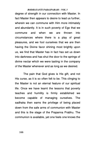 degree of strength in our connection with Master. In fact Master then appears to desire to lead us further, wherein we can commune with Him more intimately and abundantly. It is in such poverty of Ego that we commune and when we are thrown into circumstances where there is a play of great pleasures, and we fool ourselves that we are then having the Divine favor shining most brightly upon us, we find that Master has in fact has set us down into darkness and has shut the door to the springs of divine nectar which we were tasting in the company of the Master whenever and as long as we desired.