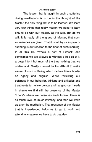 The lesson that is taught in such a suffering during meditations is to be in the thought of the Master: the only thing that is to be learned. We learn very few things that really matter: we need to learn only to be with our Master, as He wills, not as we will. It is really all the grace of Master, that such experiences are given. That it is felt by us as pain or suffering is our reaction to the heat of such learning. In all this He reveals a part of Himself, and sometimes we are allowed to witness a little bit of it, a peep into it but most of the time nothing that we understand. Mostly it would be too difficult to make sense of such suffering which certain times border on agony and anguish. While reviewing our pettiness in our behavior, thinking and attitudes and treatments to fellow beings and hanging our heads in shame we find still the presence of the Master "There"- where we ourselves loath to live. There is so much love, so much intimacy, and then we wake up after the meditation. That presence of the Master that is imperienced helps us to go to work and attend to whatever we have to do that day.