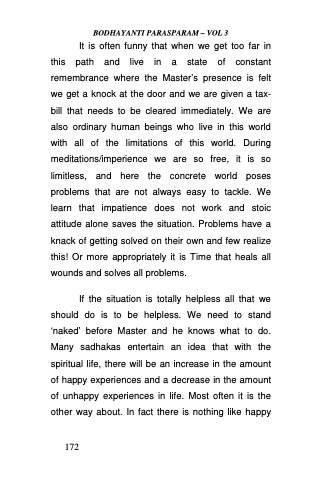 If the situation is totally helpless all that we should do is to be helpless. We need to stand ‘naked’ before Master and he knows what to do. Many sadhakas entertain an idea that with the spiritual life, there will be an increase in the amount of happy experiences and a decrease in the amount of unhappy experiences in life. Most often it is the other way about. In fact there is nothing like happy