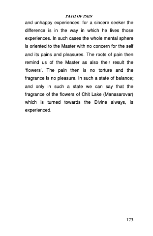 and unhappy experiences: for a sincere seeker the difference is in the way in which he lives those experiences. In such cases the whole mental sphere is oriented to the Master with no concern for the self and its pains and pleasures. The roots of pain then remind us of the Master as also their result the ‘flowers’. The pain then is no torture and the fragrance is no pleasure. In such a state of balance; and only in such a state we can say that the fragrance of the flowers of Chit Lake (Manasarovar) which is turned towards the Divine always, is experienced.