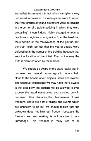 journalists to present the fact which can give a very undesired impression. If a news paper were to report that ‘that groups of young protestors were defecating in the corner of a public building in which they were protesting’, it can induce highly charged emotional reactions of righteous indignation from the herd that feels certain of the malevolence of the youths. But the truth might be just that the young people were defecating in the corner of the building because that was the location of the toilet. That is the way the truth is distorted often by the learned!