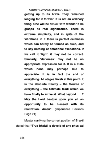 getting up to its brink. They remained longing for it forever. It is not an ordinary thing. One will be struck with wonder if he grasps its real significance. There is extreme simplicity, and in spite of the vibrations in it there is perfect calmness which can hardly be termed as such, and to say nothing of emotional excitations. If we call it ‘light’ it may not be correct. Similarly, ‘darkness’ may not be an appropriate expression for it. It is a state which none may perhaps like to appreciate. It is in fact the end of everything. All stages finish at this point. It is the absolute Reality – the Source of everything – the Ultimate Mark which we have finally to arrive at. What beyond......? May the Lord bestow upon you all an opportunity to be blessed with its realization. Amen”. (Imperience Beckons Page 21)