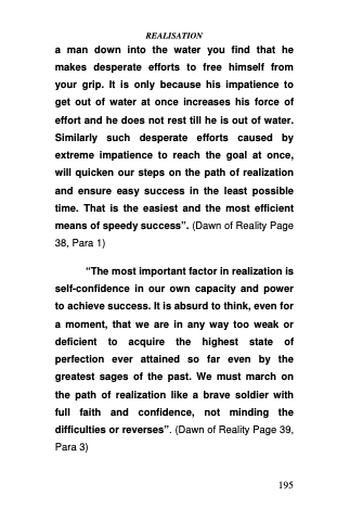 a man down into the water you find that he makes desperate efforts to free himself from your grip. It is only because his impatience to get out of water at once increases his force of effort and he does not rest till he is out of water. Similarly such desperate efforts caused by extreme impatience to reach the goal at once, will quicken our steps on the path of realization and ensure easy success in the least possible time. That is the easiest and the most efficient means of speedy success”. (Dawn of Reality Page 38, Para 1)