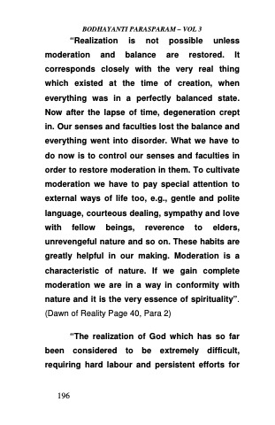 “Realization is not possible unless moderation and balance are restored. It corresponds closely with the very real thing which existed at the time of creation, when everything was in a perfectly balanced state. Now after the lapse of time, degeneration crept in. Our senses and faculties lost the balance and everything went into disorder. What we have to do now is to control our senses and faculties in order to restore moderation in them. To cultivate moderation we have to pay special attention to external ways of life too, e.g., gentle and polite language, courteous dealing, sympathy and love with fellow beings, reverence to elders, unrevengeful nature and so on. These habits are greatly helpful in our making. Moderation is a characteristic of nature. If we gain complete moderation we are in a way in conformity with nature and it is the very essence of spirituality”. (Dawn of Reality Page 40, Para 2)