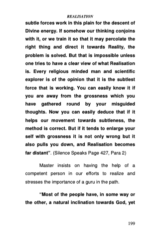 subtle forces work in this plain for the descent of Divine energy. If somehow our thinking conjoins with it, or we train it so that it may percolate the right thing and direct it towards Reality, the problem is solved. But that is impossible unless one tries to have a clear view of what Realisation is. Every religious minded man and scientific explorer is of the opinion that it is the subtlest force that is working. You can easily know it if you are away from the grossness which you have gathered round by your misguided thoughts. Now you can easily deduce that if it helps our movement towards subtleness, the method is correct. But if it tends to enlarge your self with grossness it is not only wrong but it also pulls you down, and Realisation becomes far distant”. (Silence Speaks Page 427, Para 2)